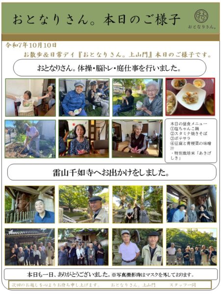 皆さん満足され笑顔が輝いていました。朝晩は秋の様相を呈してきましたが日中はまだまだ夏の日差しが照り付けます。皆さん体調に気を付けて元気にご来所されるのをお待ちしております。今日も一日お疲れ様でした。