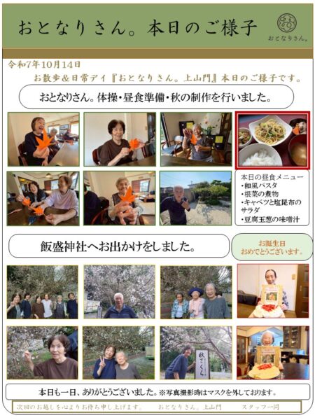 おとなりさん。上山門では今日も秋らしい活動で楽しく過ごしました。