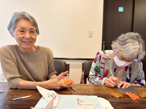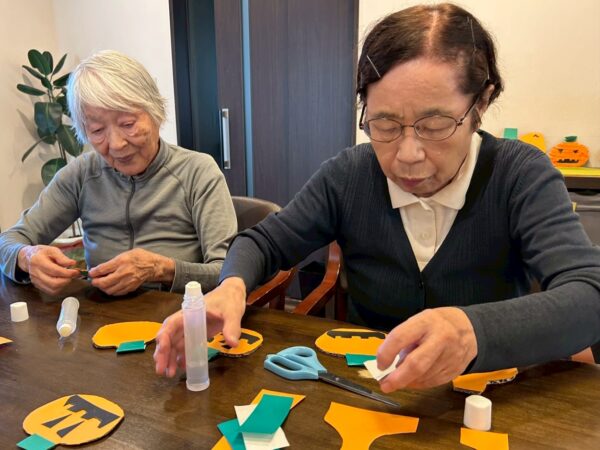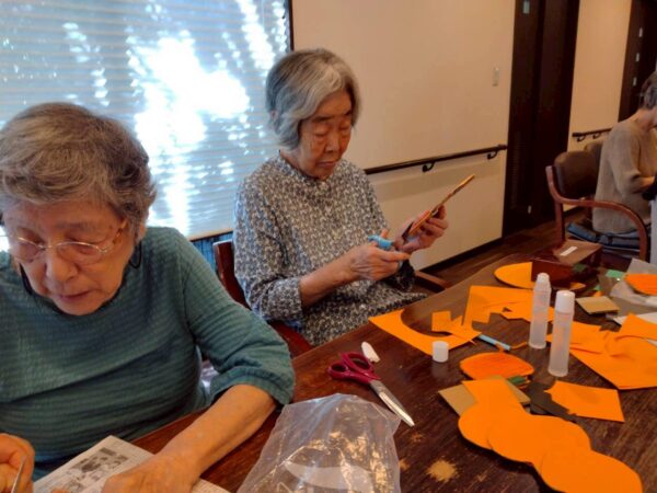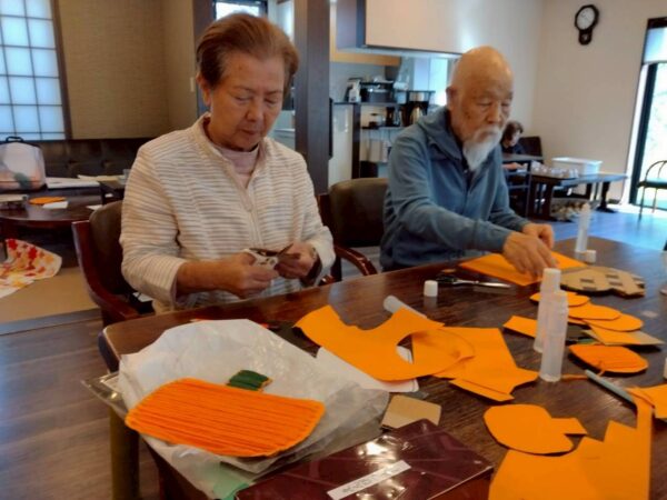 まずはおとなりさん。体操でしっかり身体を動かしていきました。体操の後はハロウィンの飾り作りと紅葉飾りをしました。