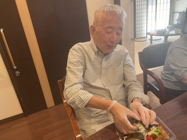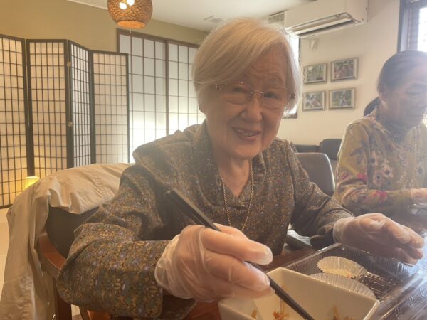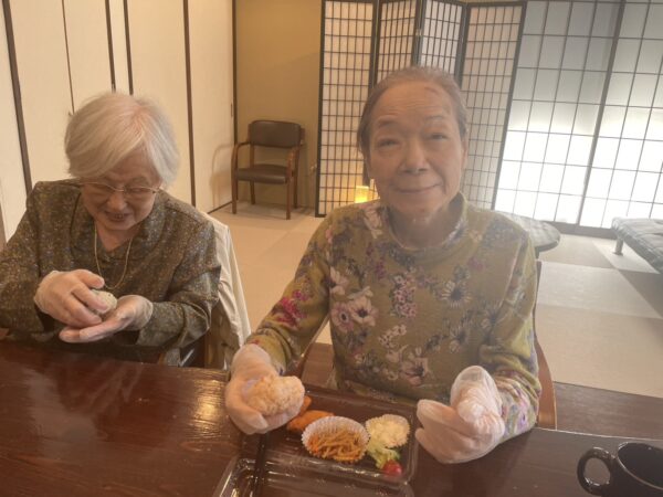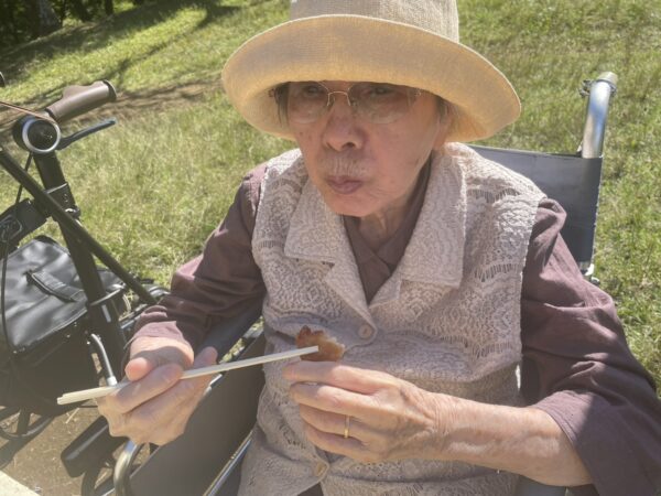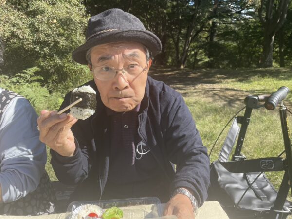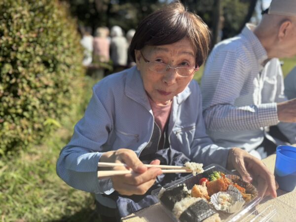 出来上がったお弁当を持ち、桜ケ丘公園へハイキングを行きました。広場に着き、先ほど作ったお弁当で昼食を。自然の中で食べるお弁当はやはり格別ですね。箸が進み、笑顔も自然に出ます。