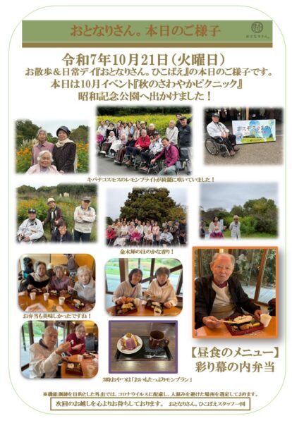 今日のおとなりさん。ひこばえは10月イベント「秋のさわやかピクニック」で昭和記念公園に