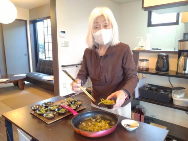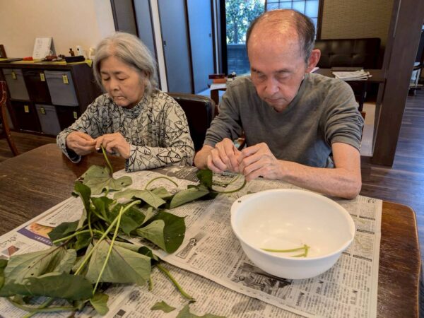 午前中はお庭の芋づるの皮を剥いて頂き昼食に頂きました。