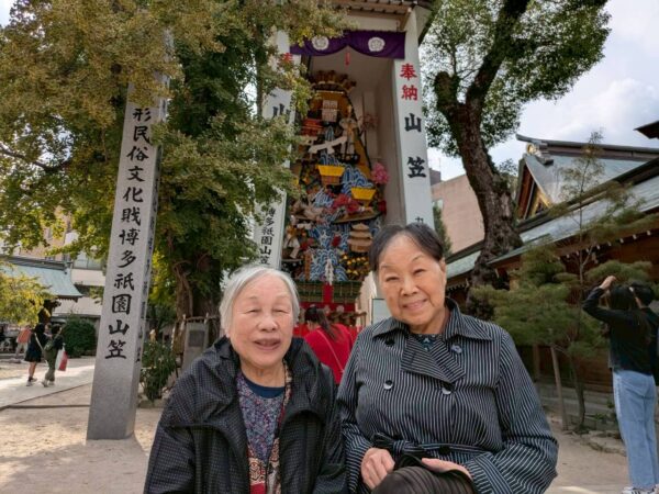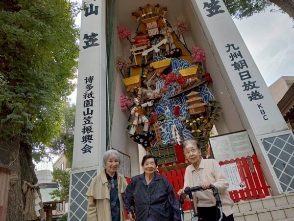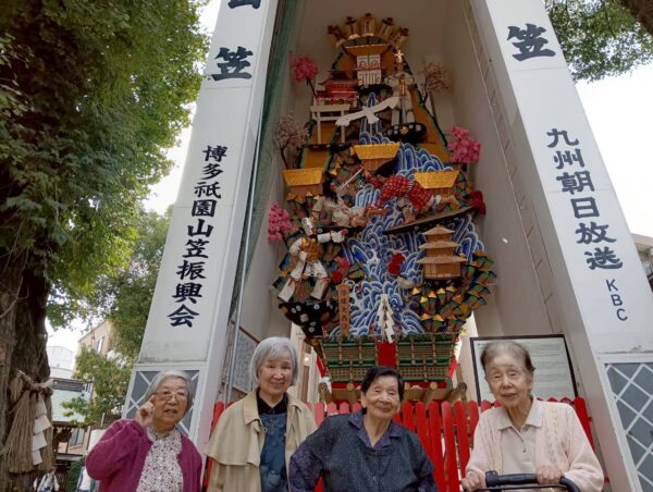 そして皆さんお待ちかね、午後からのお出かけでは博多区の櫛田神社へ。立派な飾り山が素晴らしく、博多を代表するお祭り、神事である「博多祇園山笠」の歴史を感じながら境内を散策しましたね。