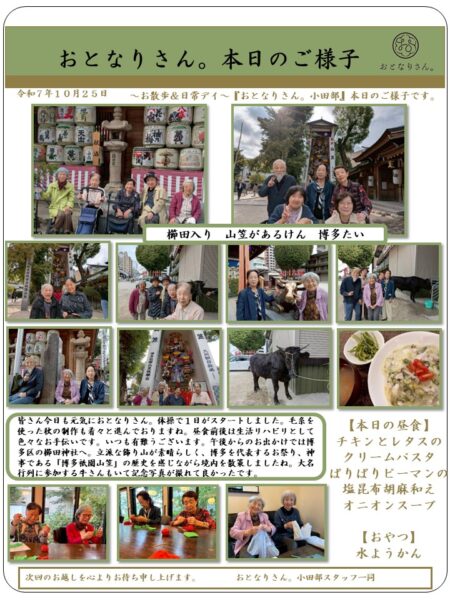 催し物も開催中で大名行列があり、参加する牛さんもいて記念写真が撮れて良かったです。今日は久しぶりの「お櫛田さん」へお出かけして天神、博多と街中のドライブも楽しく思い出話にも花が咲いて楽しかったです。また行きましょう。それでは本日もお疲れ様で御座いました。