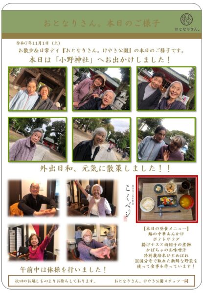 午後は「小野神社」へ外出しました。心地よい気候に素敵な笑顔が絶えず、静かな境内でゆっくりとした時間が流れていましたね。
