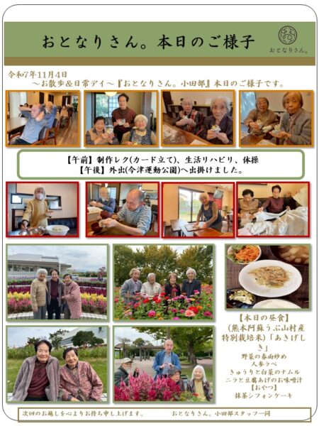 おとなりさん。の庭の金木犀も満開で窓を開けると心地の良い風と共にふんわりとした香りが幸せな気持ちにさせてくれご利用者様の会話も弾んでおられます。