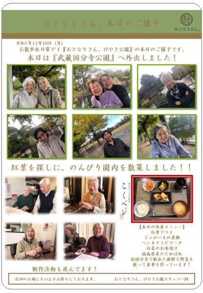 さて、本日は『武蔵国分寺公園』へ外出致しました。少し外はひんやりとし、皆様羽織りものを着てお出かけ致しました。外出時はあいにくの曇り空でしたが、冬の到来を実感でき、園内のイチョウの葉もキレイに色付き始め、贅沢な散策となりました。