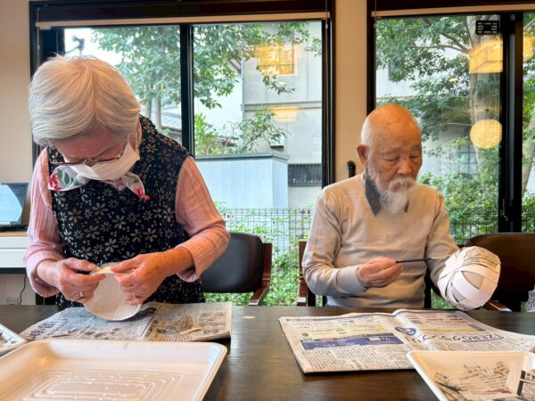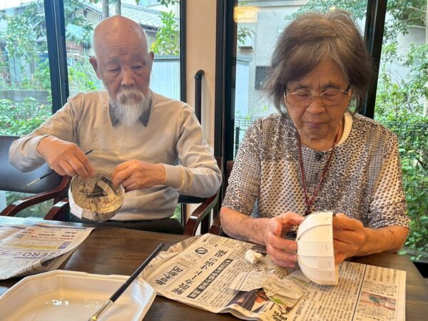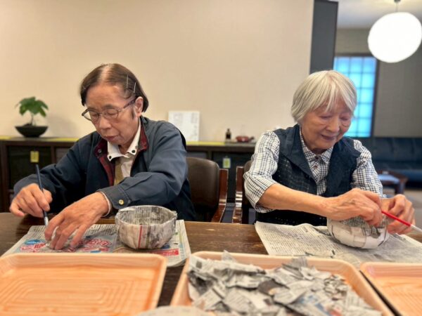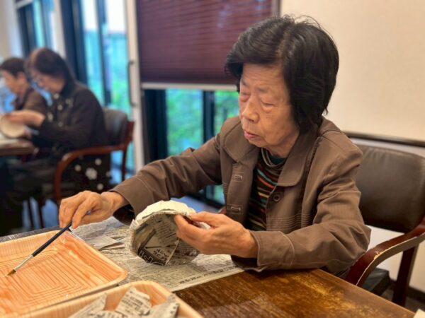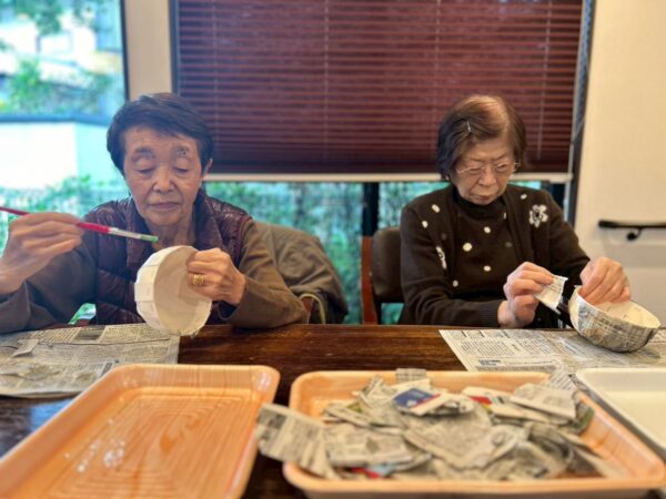 画用紙を切り張り付けてボール状に形を整えます。新聞紙をちぎりノリで張り付ける作業を行いました。