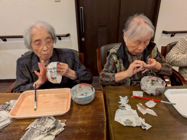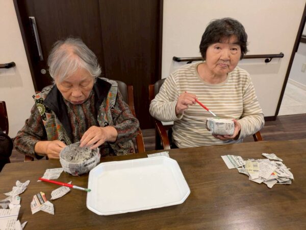 型に沿って新聞紙を張り付けていく作業です。