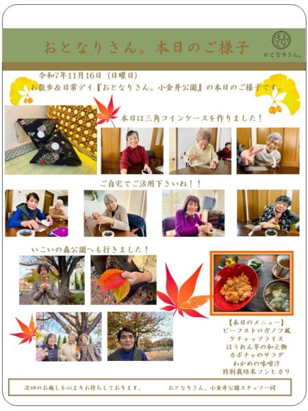 さて本日おとなりさん。小金井公園では午前中は三角コインケースを作りました!