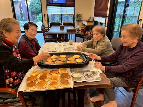 室内に残られた利用者様はホットプレートにてパンケーキを作って頂き中に餡子と生クリームを入れて