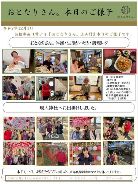 現人神社へのお出かけは、終始ご利用者様の素敵な笑顔が溢れる、大変楽しい一日となりました。また次回も、皆様と一緒にお出かけできることを楽しみにしています!