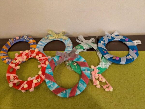 午前中の活動はクリスマスの制作です。毛糸を使ったクリスマスリースです。