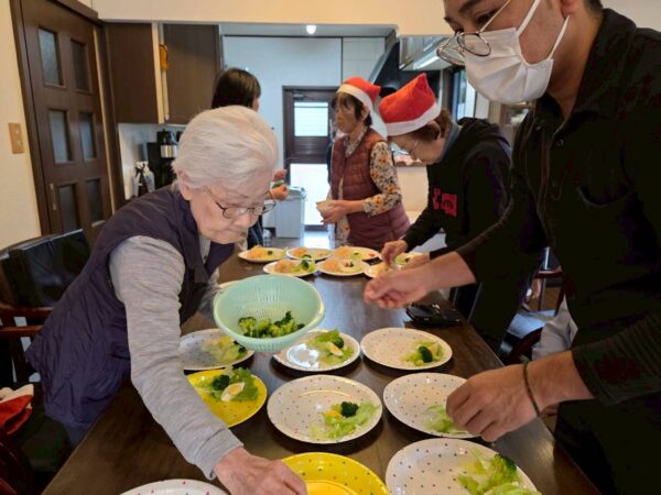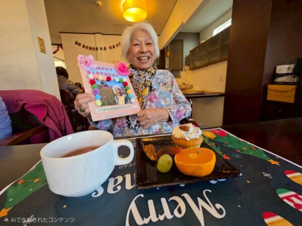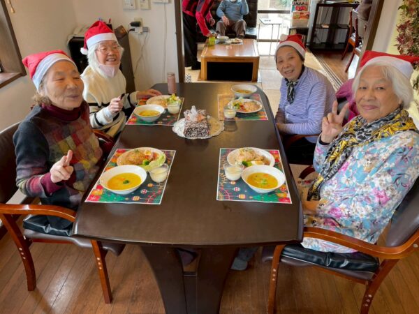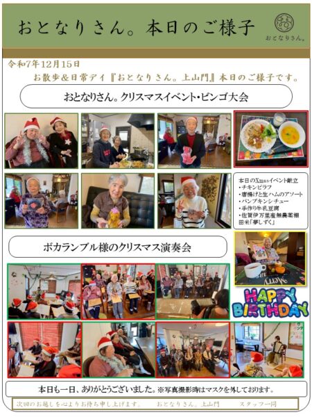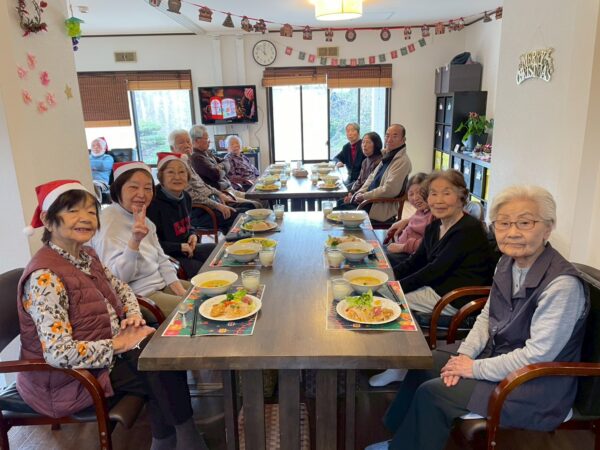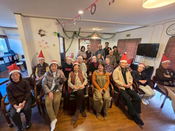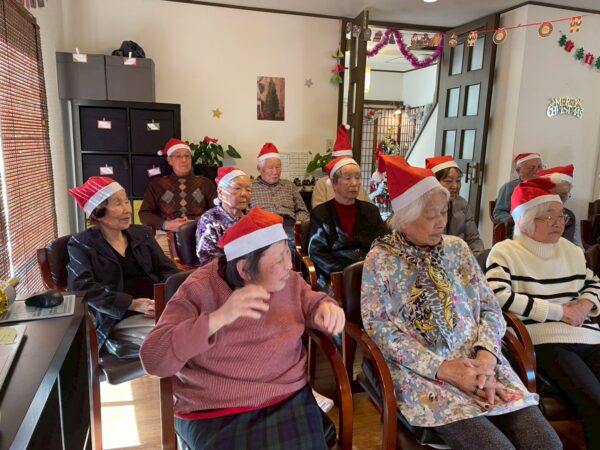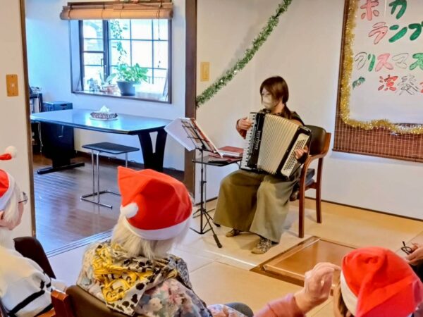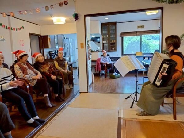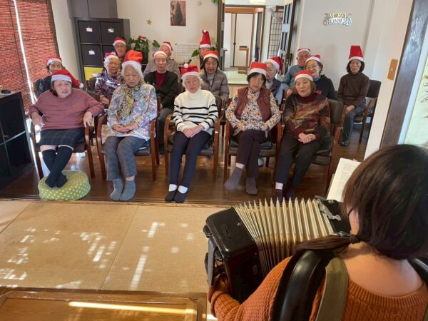 皆でクリスマスソングやリクエストを出した歌を合唱しました。皆さんとてもよく声が出ていて私たちもビックリしました。本日お誕生日の方へもアコーディオン演奏に合わせてハッピーバースデーの歌のプレゼントもありました。