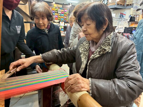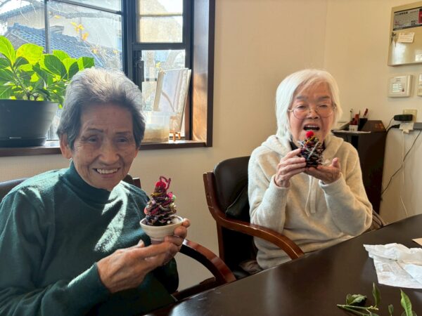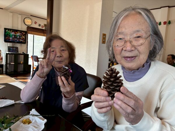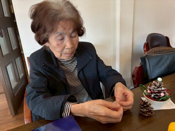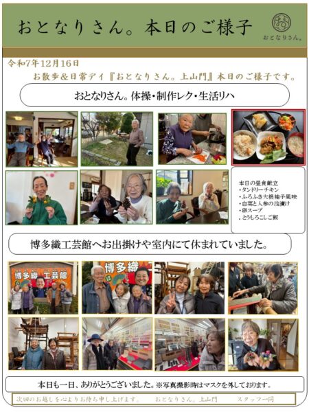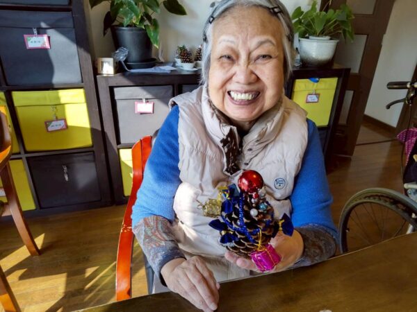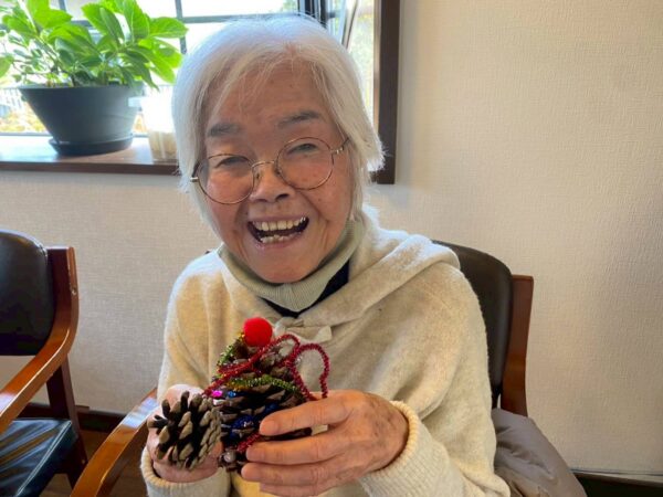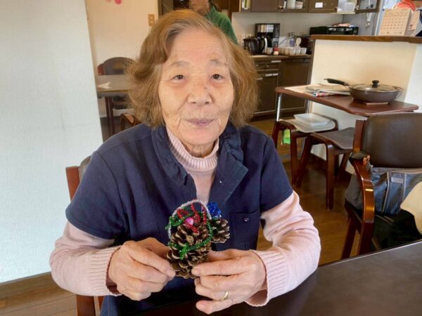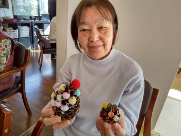 皆さんでクリスマスに向けての松ぼっくりのクリスマスツリー作り、生活リハでのお手伝いと八面六臂の大活躍です。午後からは博多織工芸館へお出掛けしてきました。