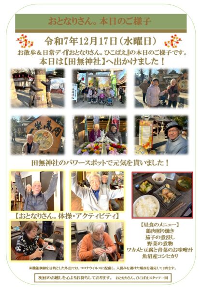 ひこばえでは、今年一年元気で過ごせたことを感謝して、田無神社に御礼参りに行ってきました。