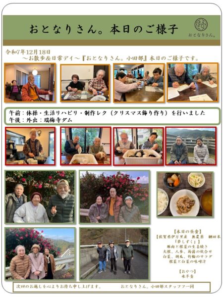 皆様こんにちは。今日は朝から曇り空でスッキリしない一日となりましたね。小田部は体操から元気に体操からスタートです。午前中の活動はクリスマスの飾り制作を行いました。