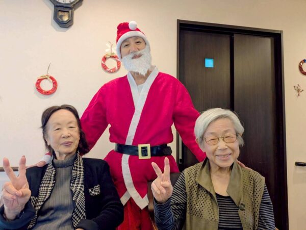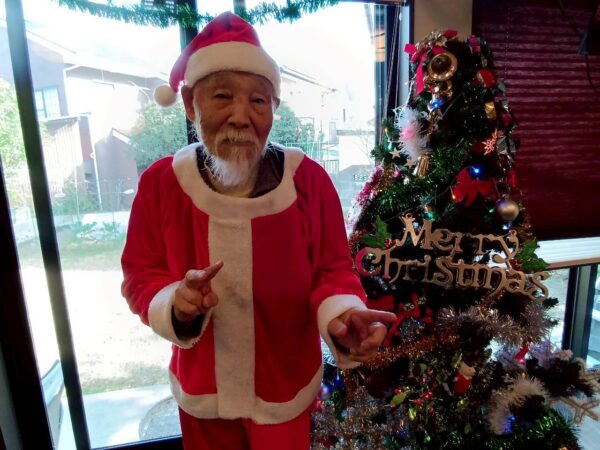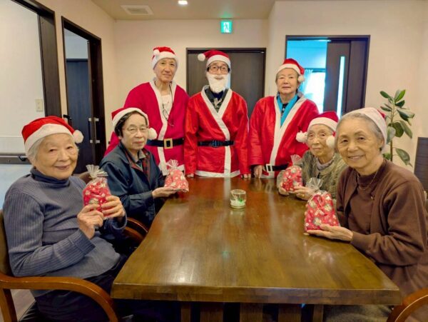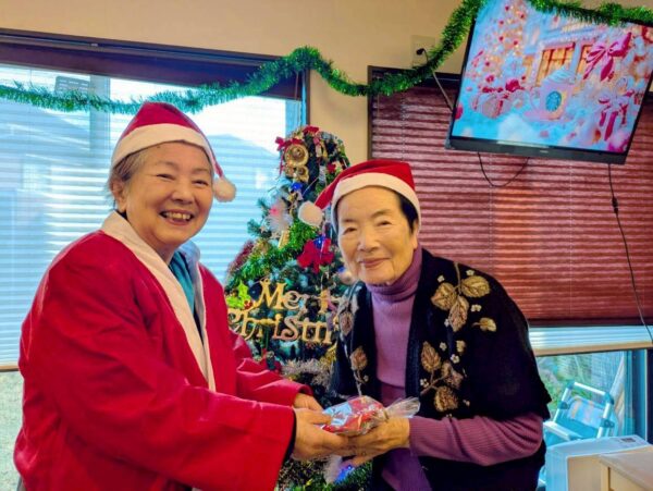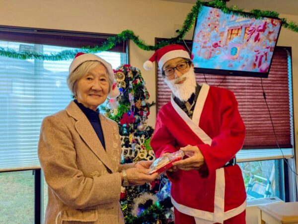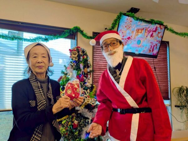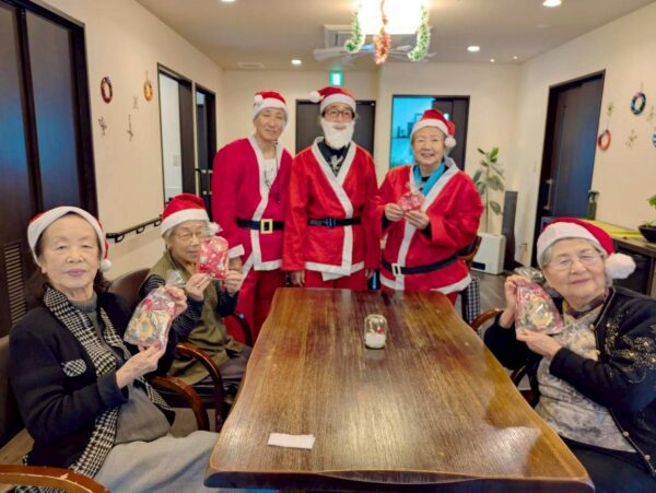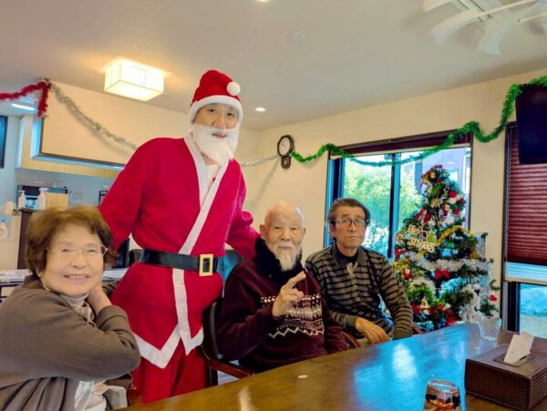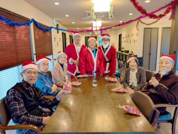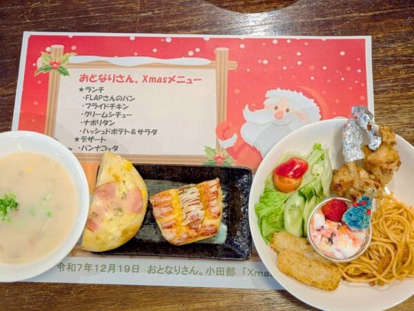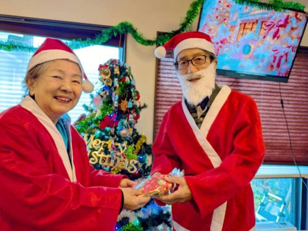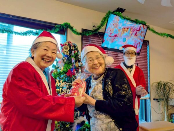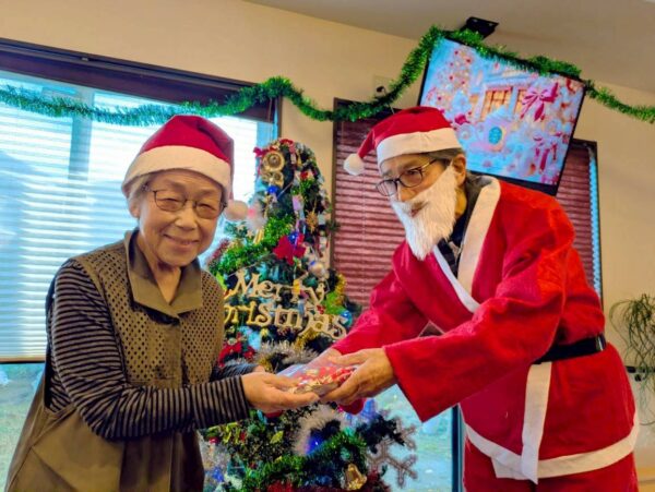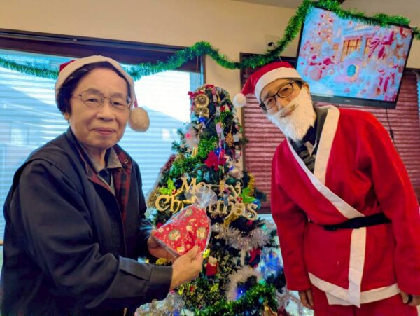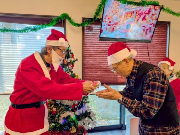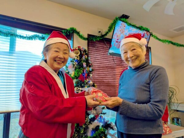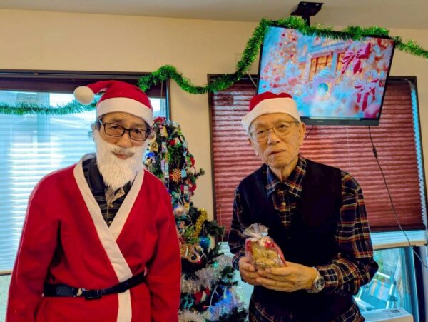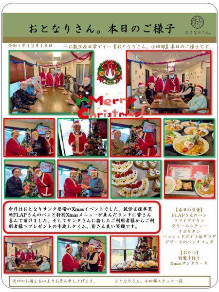 皆さんこんにちは。おとなりサンタ登場のXmasイベントでした。就労支援事業所FLAPさんのパンと特別Xmasメニューが並んだランチに皆さん喜んで頂けました。そしてサンタさんに扮したご利用者様からご利用者様へプレゼントの手渡しタイム。皆さん良い笑顔です。