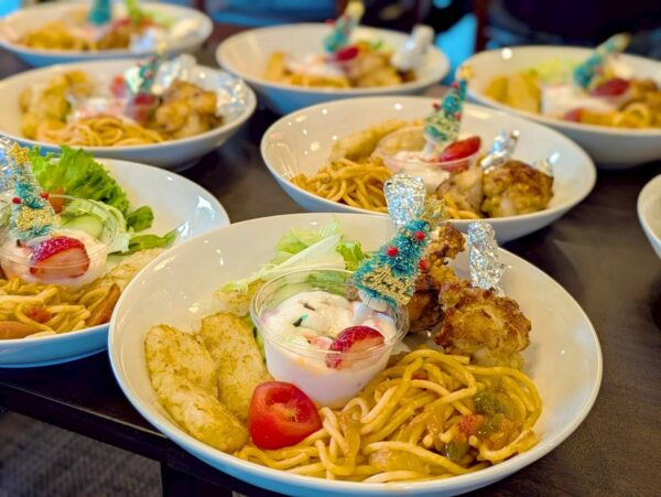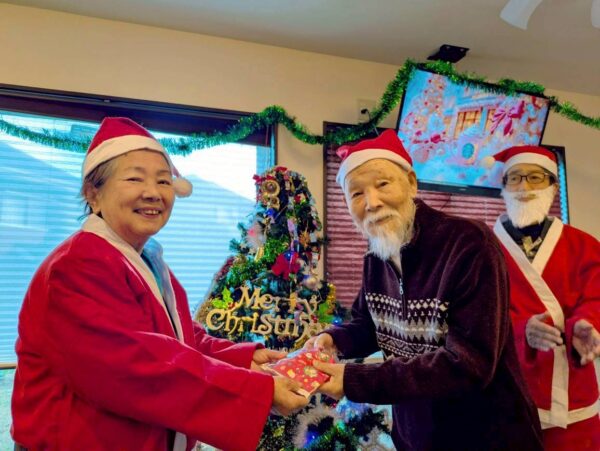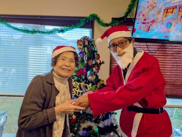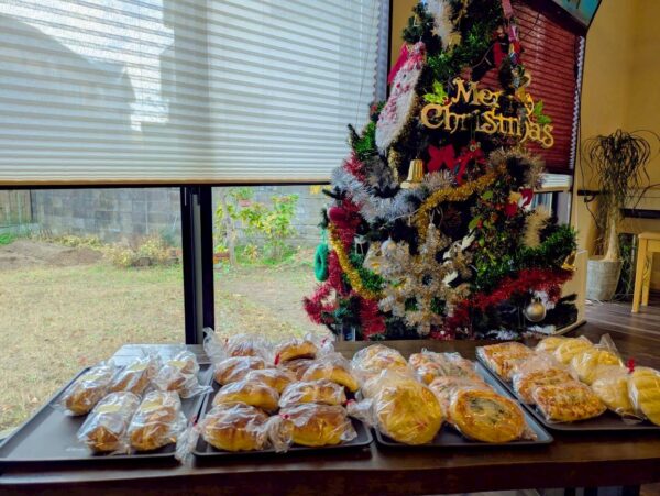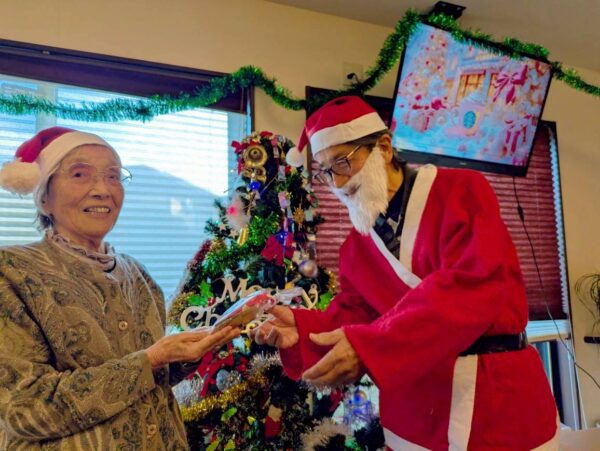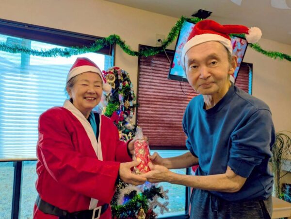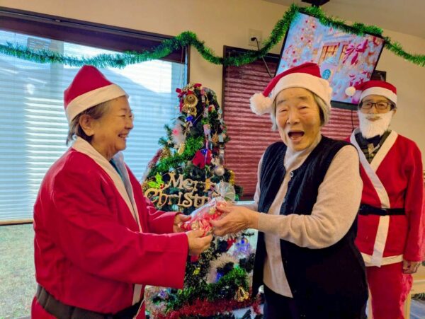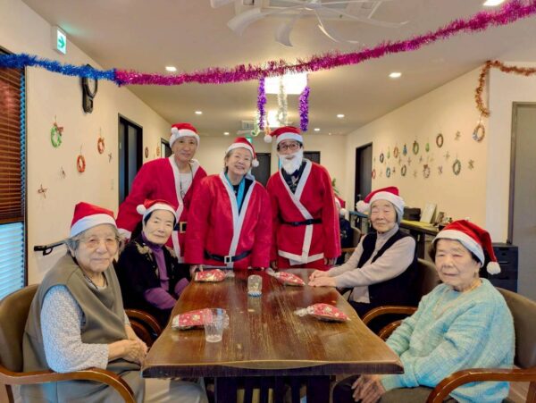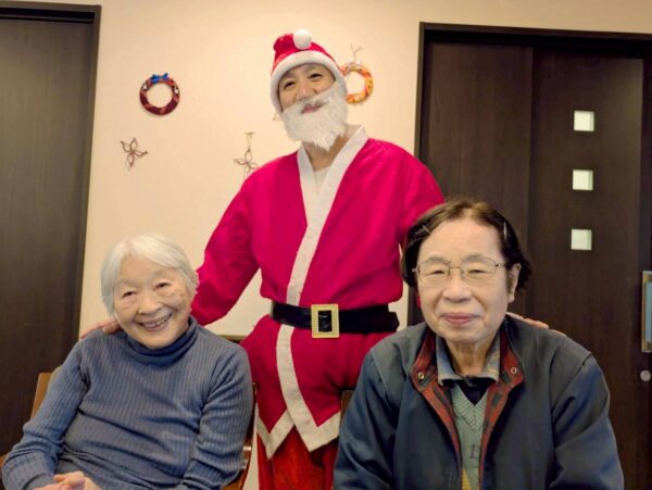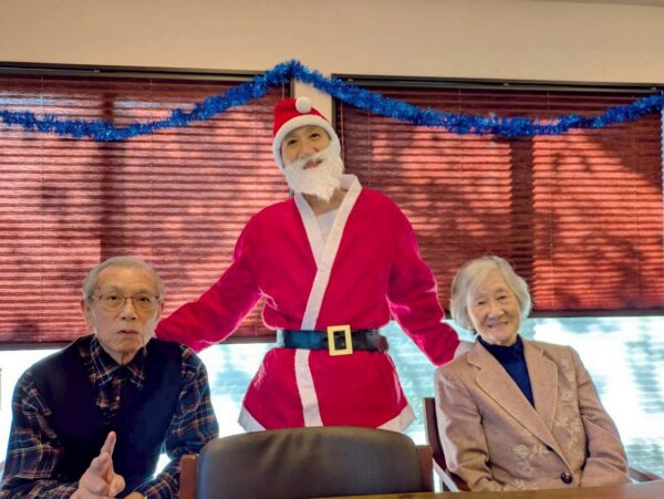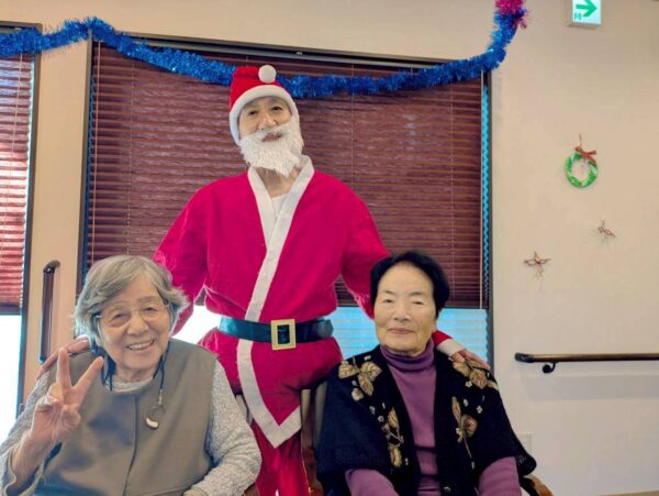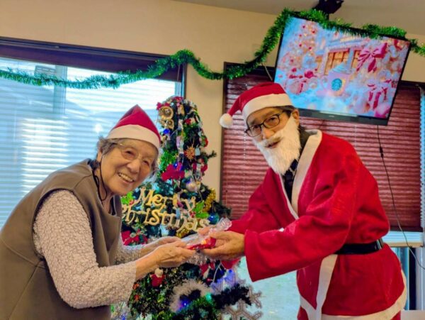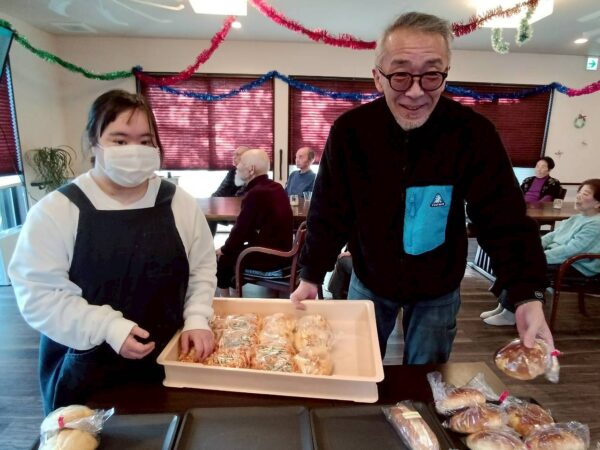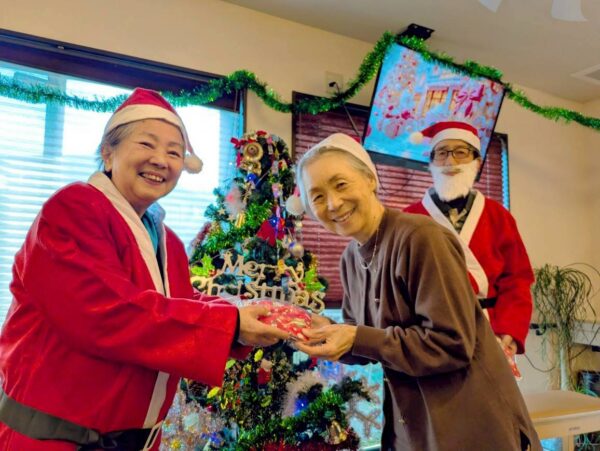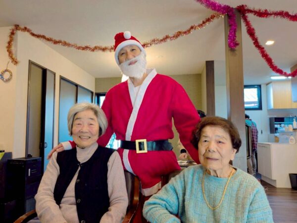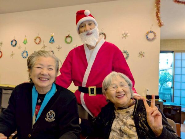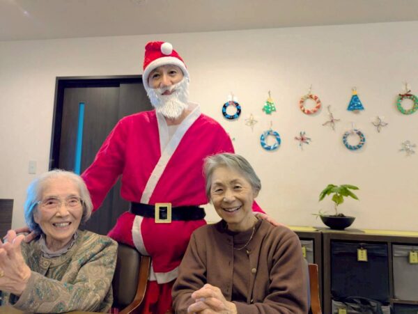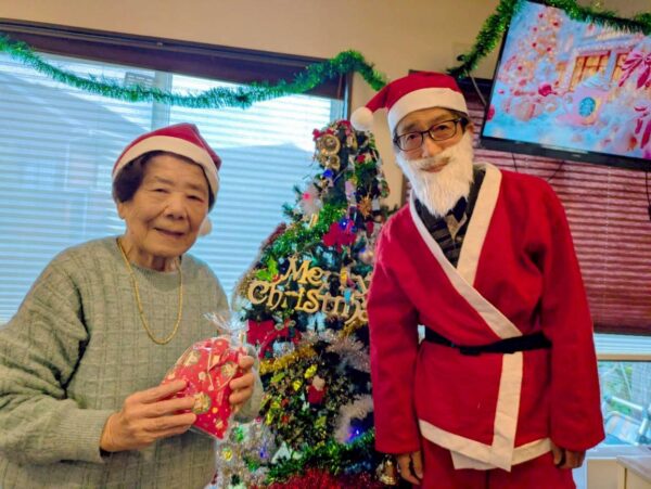 皆さんこんにちは。おとなりサンタ登場のXmasイベントでした。就労支援事業所FLAPさんのパンと特別Xmasメニューが並んだランチに皆さん喜んで頂けました。そしてサンタさんに扮したご利用者様からご利用者様へプレゼントの手渡しタイム。皆さん良い笑顔です。