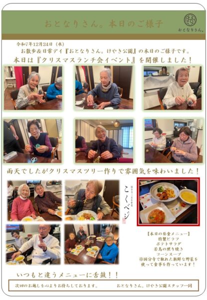 クリスマスの雰囲気も味わう事が出来、皆様美味しいと舌鼓をしておりました。