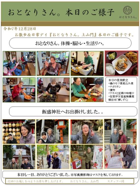 皆様こんにちは。本日は寒さが幾分和らぎましたが、それでも空気の冷たい一日でした。おとなりさん。上山門では皆さん、体操や脳トレに生活リハとエネルギッシュに活動されていました。