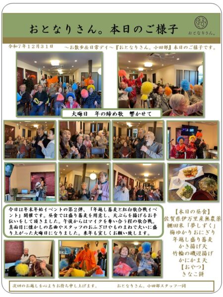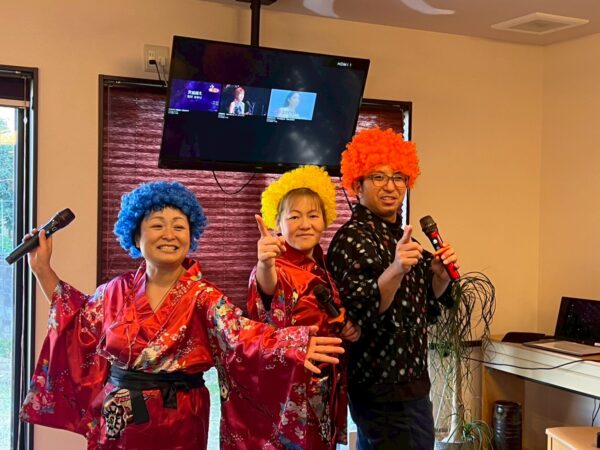 特定技能実習生スタッフも日本語で素敵に松田聖子の会いたくてを歌い上げました。ご利用者の皆様も感動してましたね。今年も1年、本当に有難う御座いました。そして来年も宜しくお願い致します。おとなりさん。は明日の元旦も絶賛営業中です。美味しいお節料理を用意し、午後は護国神社へ初詣です。一緒に素敵な1年を迎えましょう。お疲れ様で御座いました。