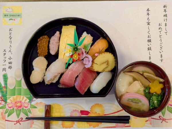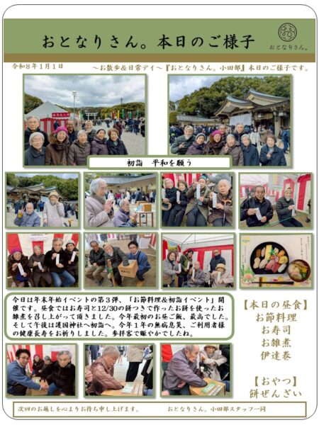 令和8年、2026年、干支は60年に1度の丙午。新年あけましておめでとうございます。本年もどうぞ宜しくお願い致します。そして本日は年末年始イベントの第3弾、「お節料理&初詣イベント」開催です。昼食ではお寿司と12/30の餅つきで作ったお餅を使ったお雑煮を召し上がって頂きました。今年最初のお昼ご飯、最高でした。