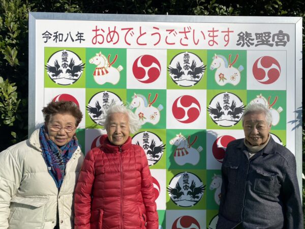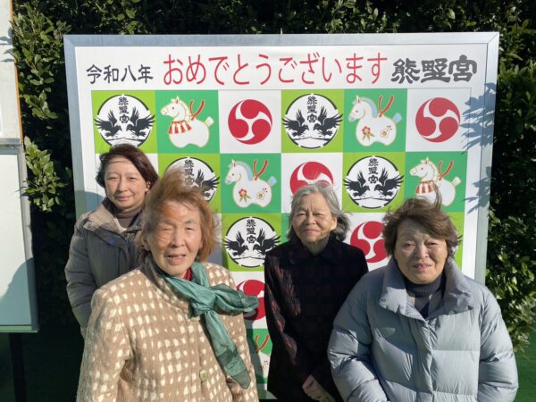 午年にちなんだ絵馬を背景に記念撮影致しました。