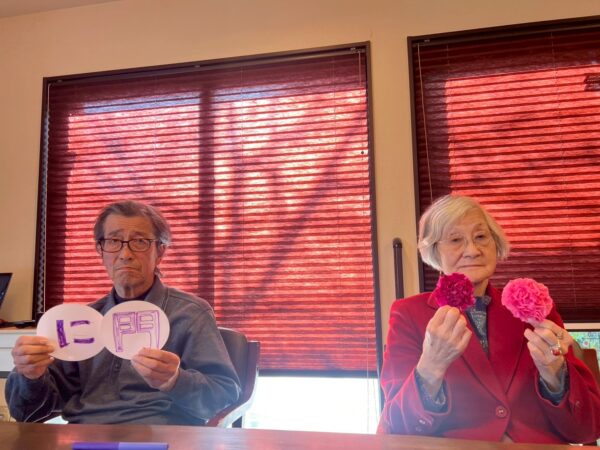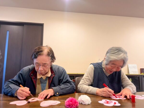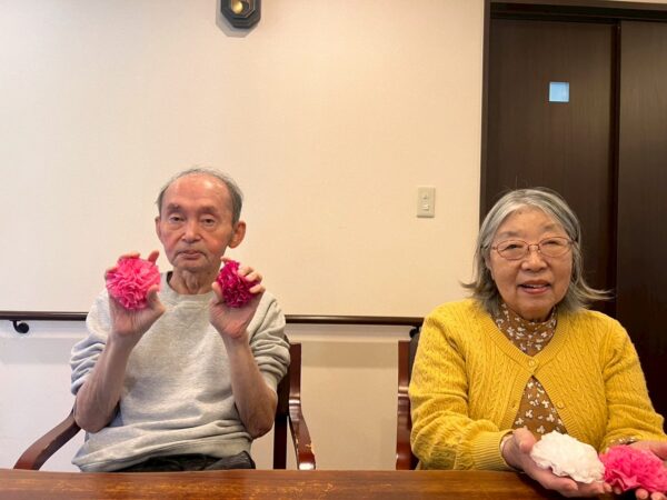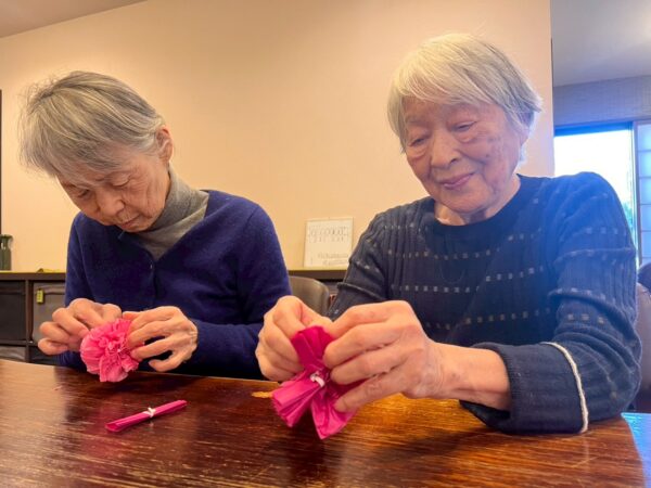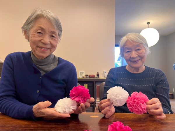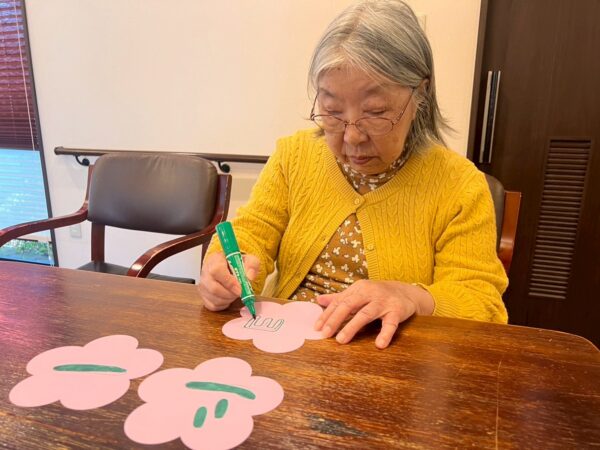 ペーパーフラワーで花飾りを作って頂いたり、文字を書いて頂いたり、色を塗って頂きました。