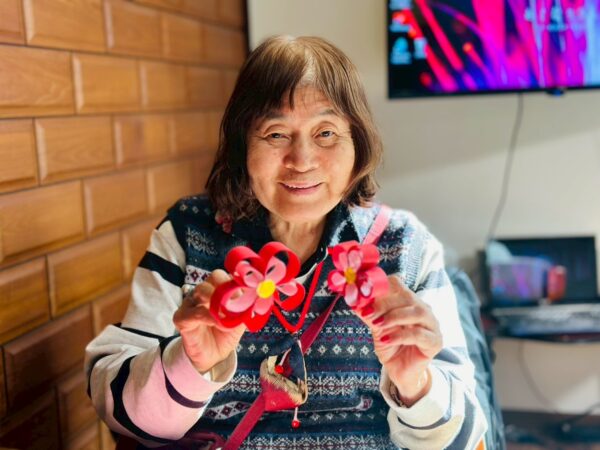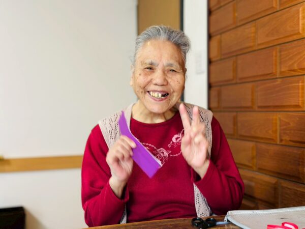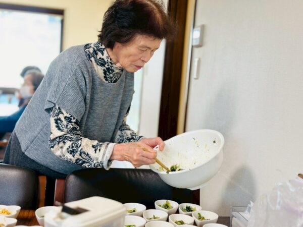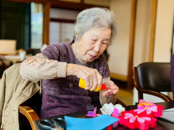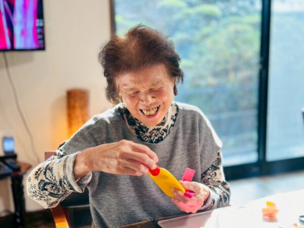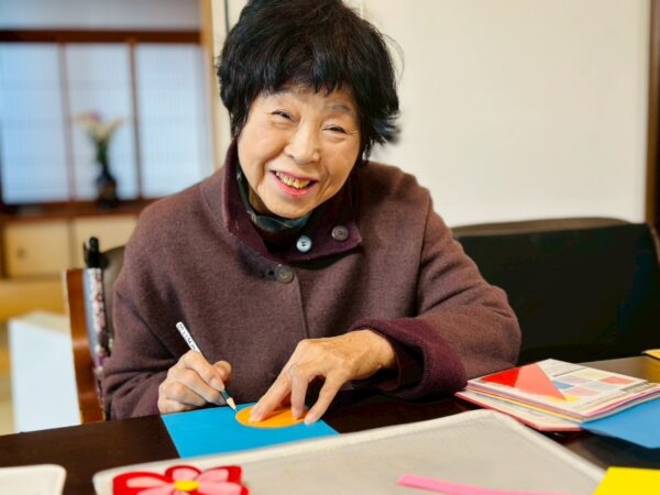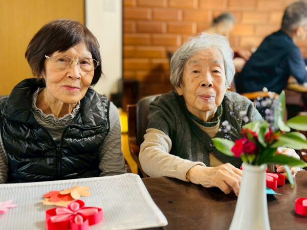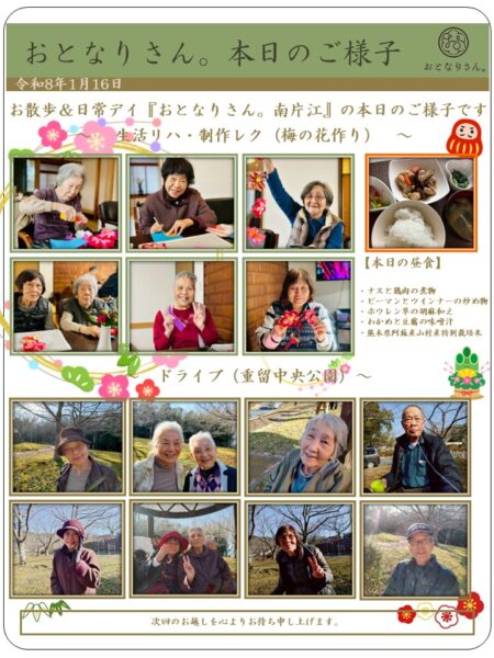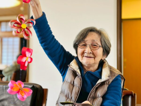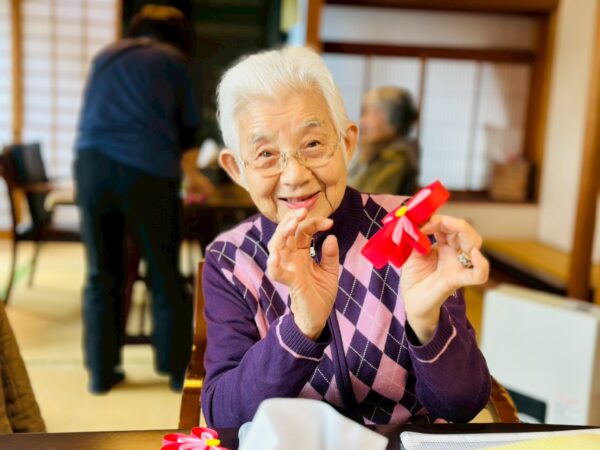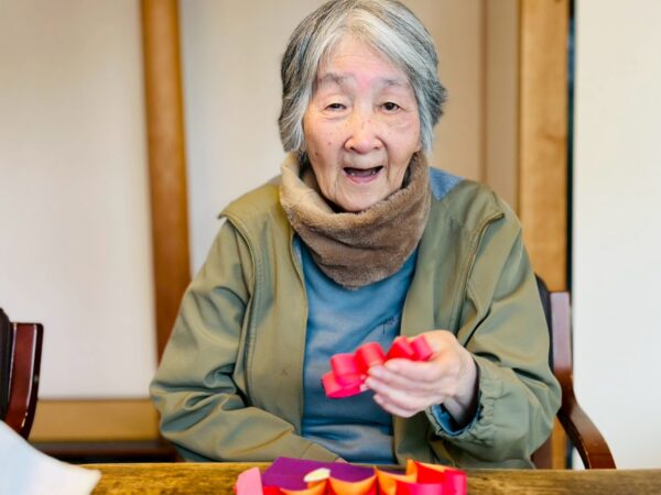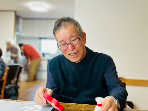 午前中の制作活動では、色画用紙で梅のお花作りを行いました。少しずつ完成に近づいていますね。
