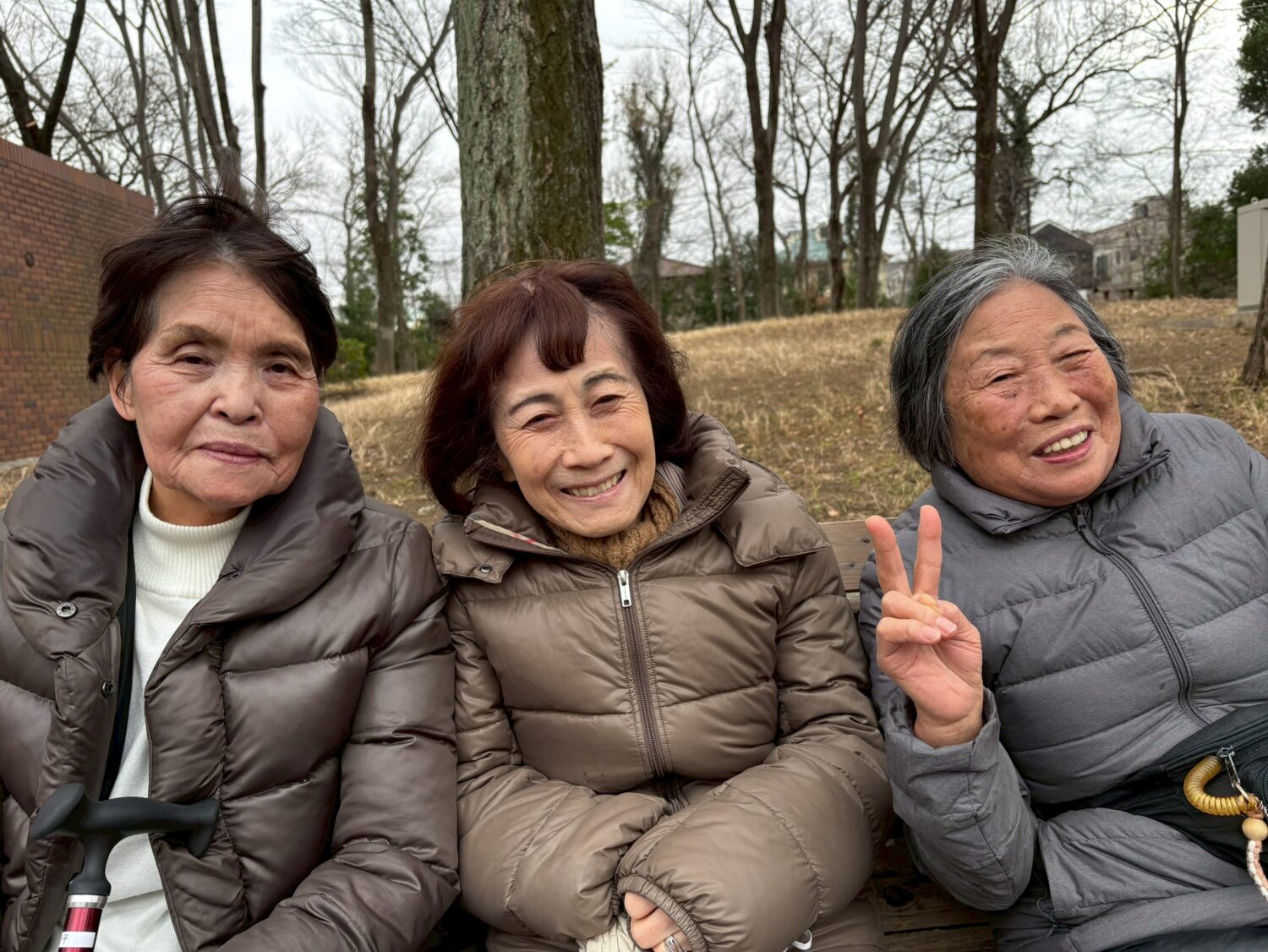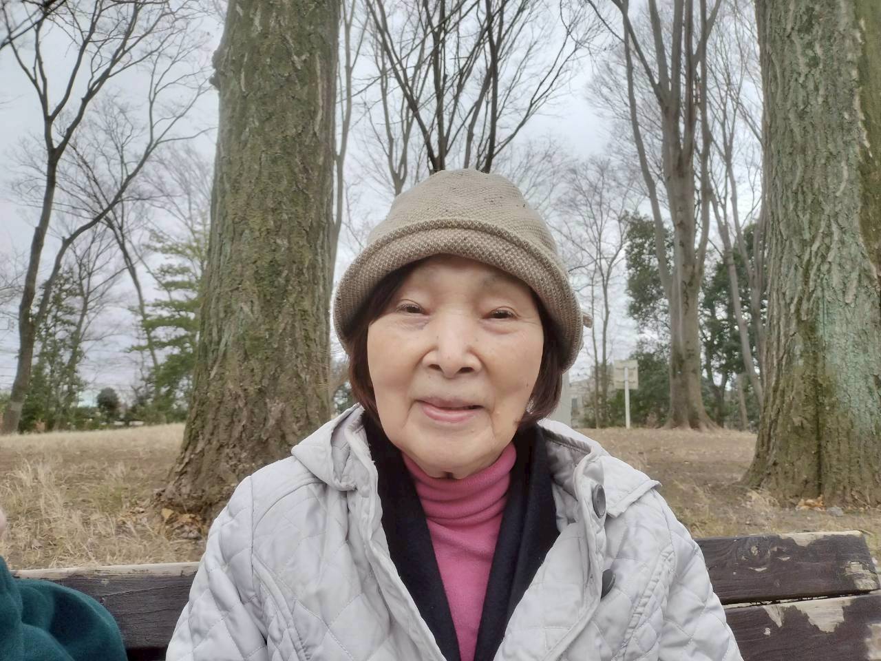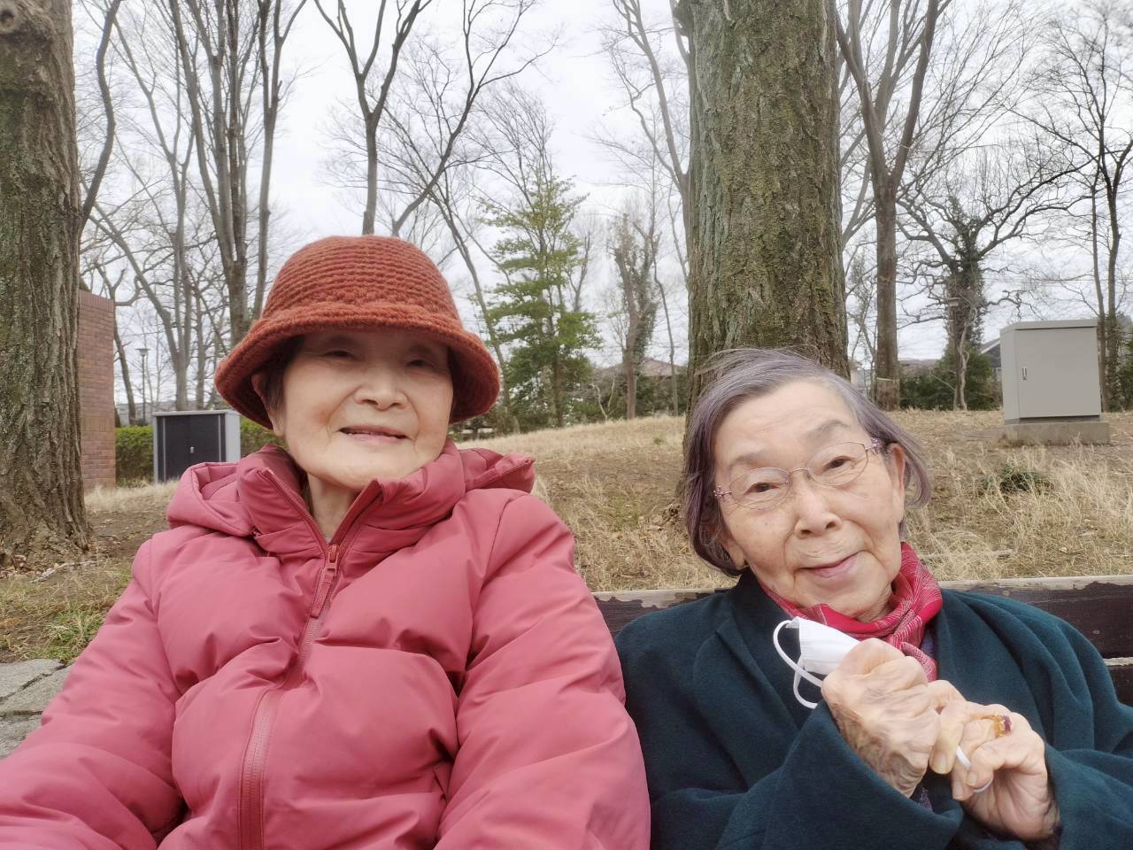 風が吹いて寒く感じましたが元気に歩行訓練を行いました。散歩のあとはベンチでひと休み。