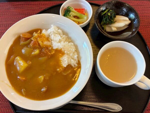 今日のお昼はカレーライスに、おとなりさん。の庭で収穫したカブの漬物です。