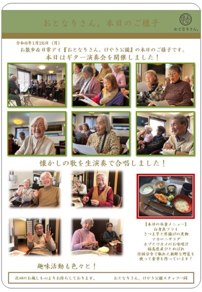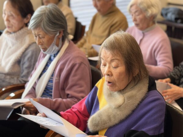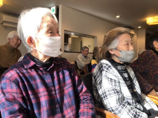 今回は「ここに幸あり」「私の城下町」「花嫁」「君といつまでも」など昔のヒット曲を中心に盛り上がりました。皆様で一緒になって歌ったり、手拍子でリズムをとったりと心躍る、和やかな時間を過ごす事が出来ました。