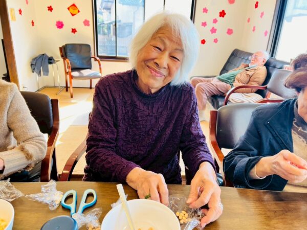 午前中は制作レクを行いました。明日の「節分イベント」で使う豆包みを行いました。