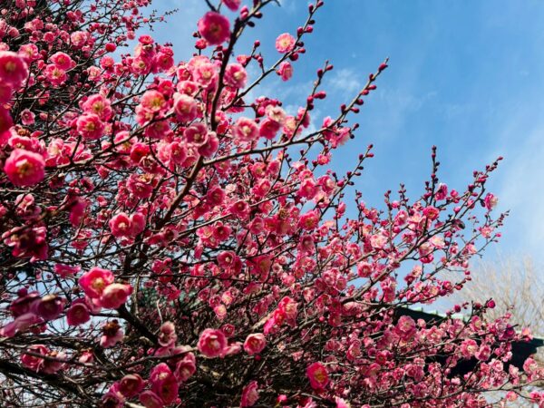 満開の紅梅が出迎え