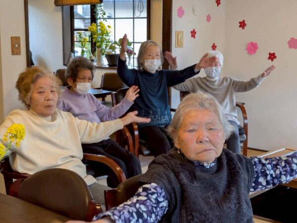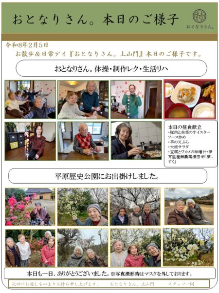 皆様こんにちは。今日は時折晴れ間が見えましたが雲の多い一日でした。おとなりさん。上山門では元気におとなりさん。体操からスタートです。