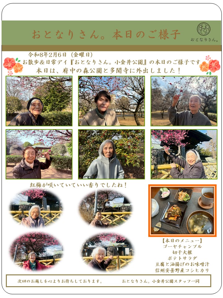日差しが暖かく感じて梅林まで歩行訓練をおこないました。白梅、紅梅が咲いていてきれいでしたね。