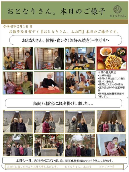 本日も「おとなりさん。上山門」では皆様元気にご来所されています。