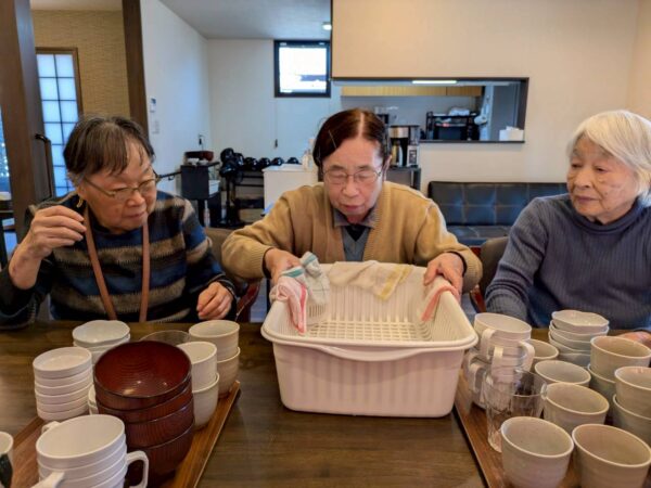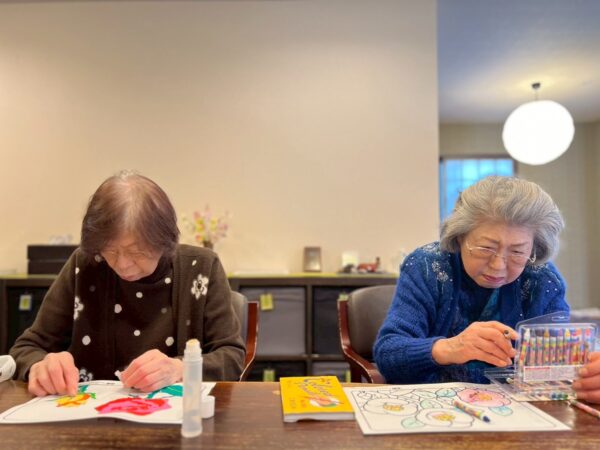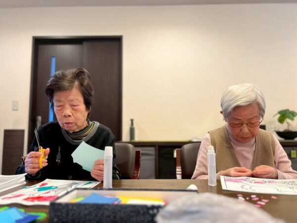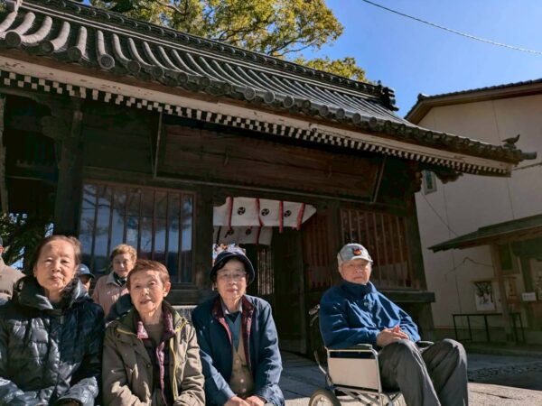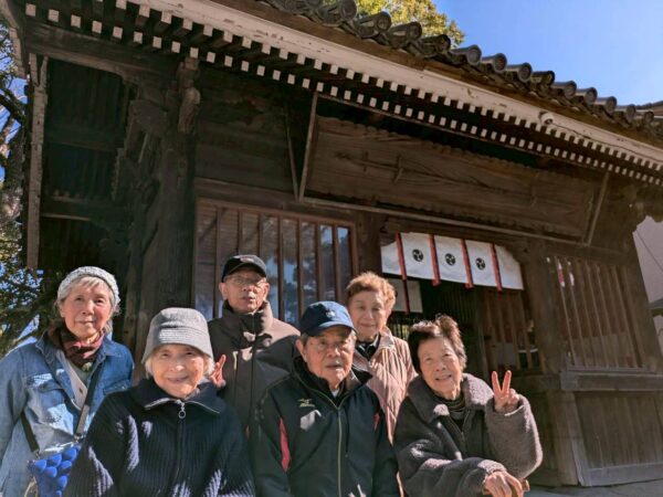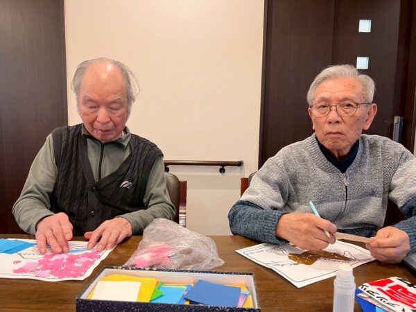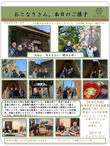境内を沢山散策し、大きな石からパワーをもらい記念撮影。素敵な参拝になりました。午前中はおとなりさん。体操でしっかり運動して制作活動では春の花々のちぎり絵に挑戦して頂きました。完成が楽しみです。生活リハビリとして色々なお手伝いもして下さりいつも助かっております。有難う御座いました。