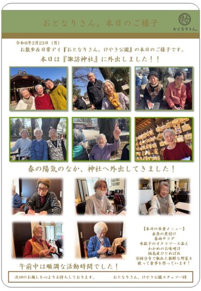 そんななか、おとなりさん。けやき公園では立川にある諏訪神社へ外出しました。