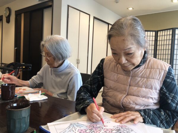編み物に切り絵、脳トレなど、皆様和気あいあい談笑されながら制作に取り組まれております。