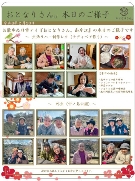 本日は2月最後日、笑顔が多く見られ、一日を通して穏やかに楽しく過ごしました。