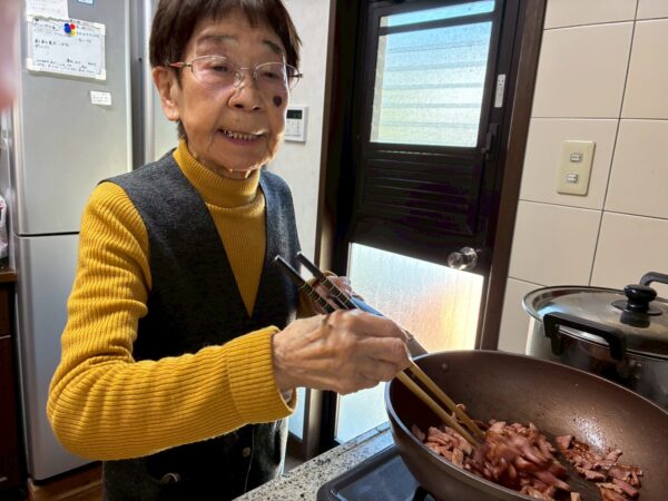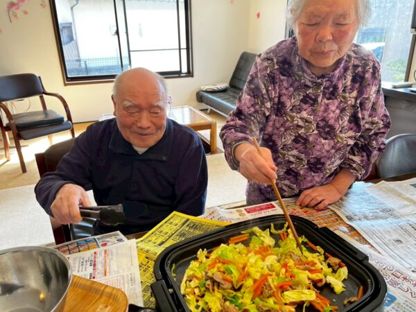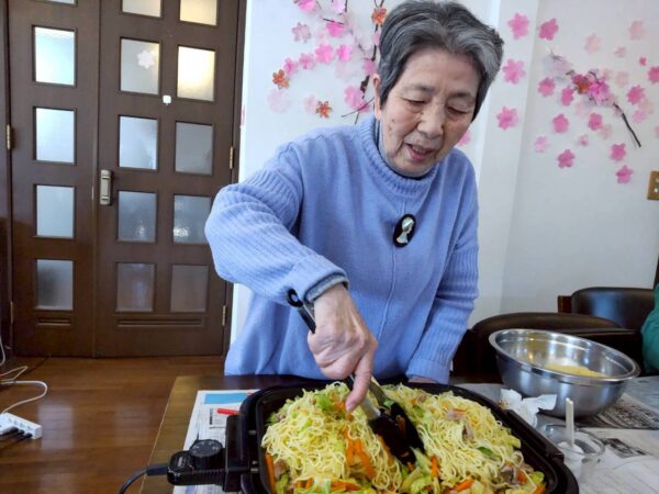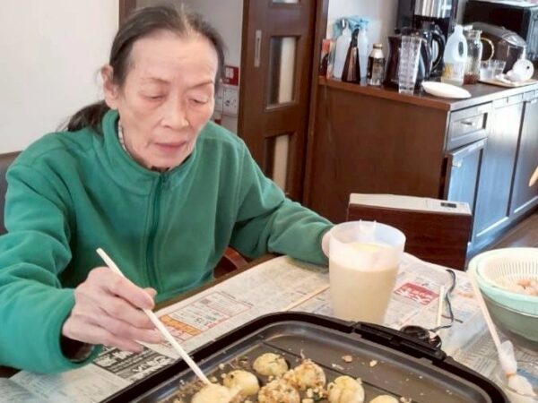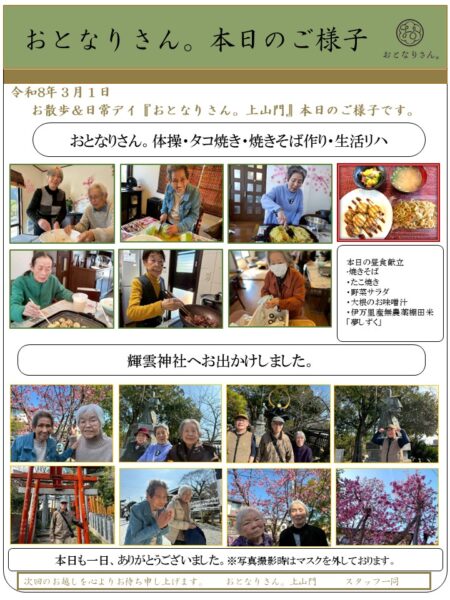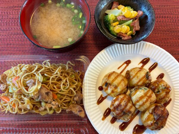 おとなりさん。上山門では今日は食レクで焼きそば作りとたこ焼き作りを行いました。