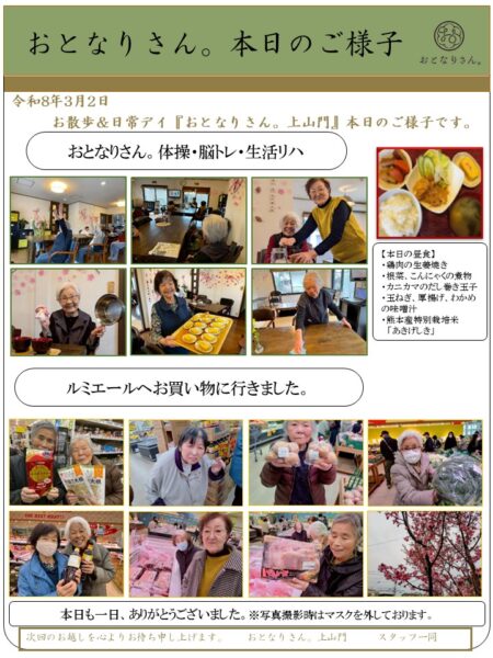 皆様こんにちは。今日はお昼前から雨が降り出し春雨の一日でした。おとなりさん。上山門では雨に負けないように皆さん元気に活動されました。