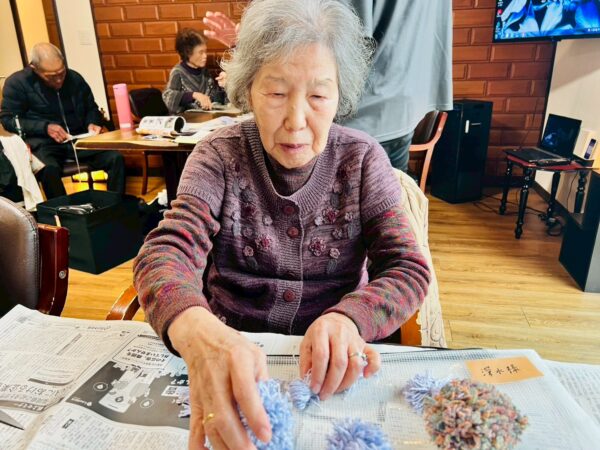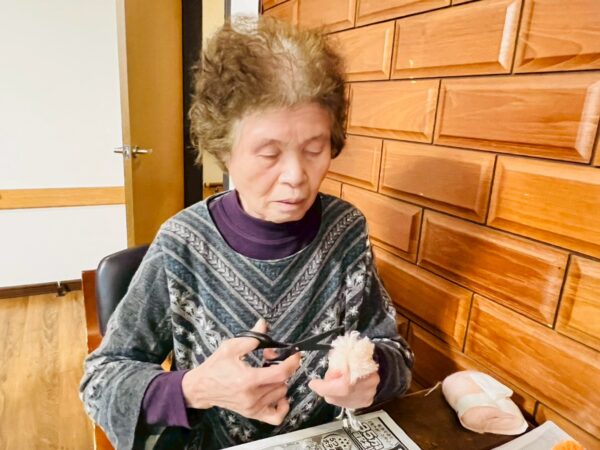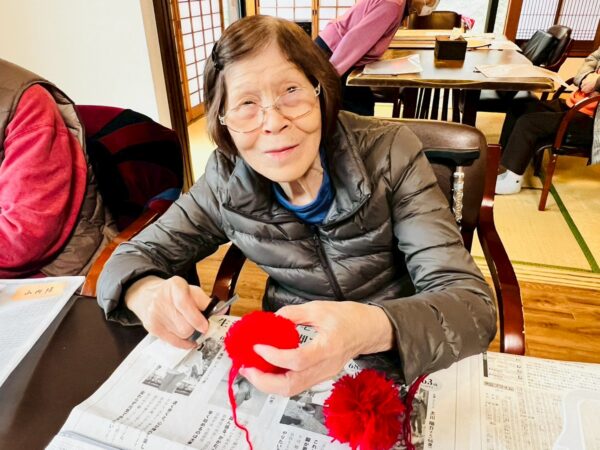 午前中の制作活動は、毛糸を巻いてテディベア作りです。