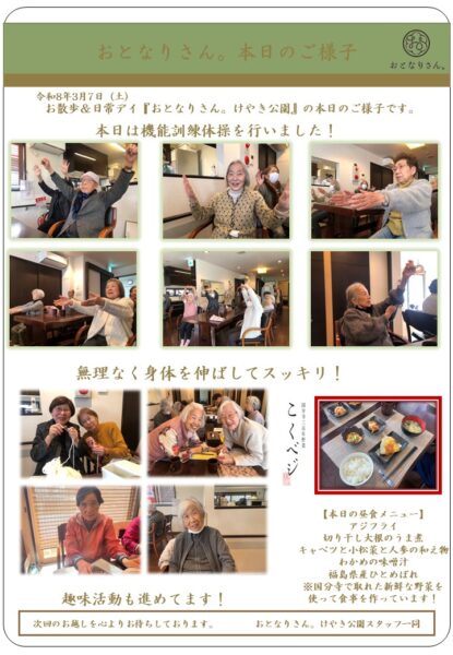 おとなりさん。けやき公園では、本日はストレッチ体操を行いました。