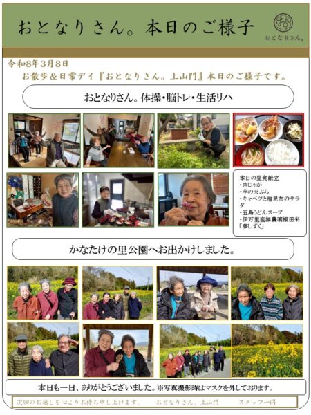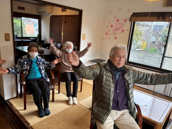 おとなりさん。上山門では今日も皆様と機能訓練を通し、元気に楽しく過ごしました。