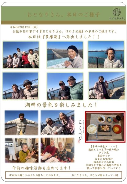 おとなりさん。けやき公園では午後に多摩湖まで外出しました。
