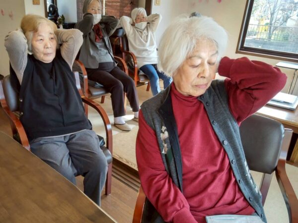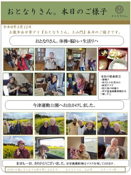 おとなりさん。上山門では今日も皆様と機能訓練を通し、元気に楽しく過ごしました。