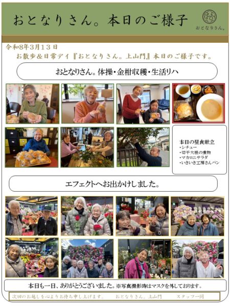 今日もお出掛けができ皆さんと一緒に楽しく過ごす事ができて良い一日になりました。